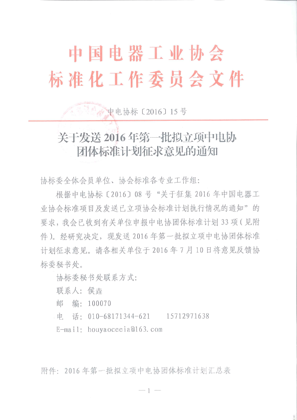 关于发送2016年第一批拟立项中电协团体标准计划征求意见的通知