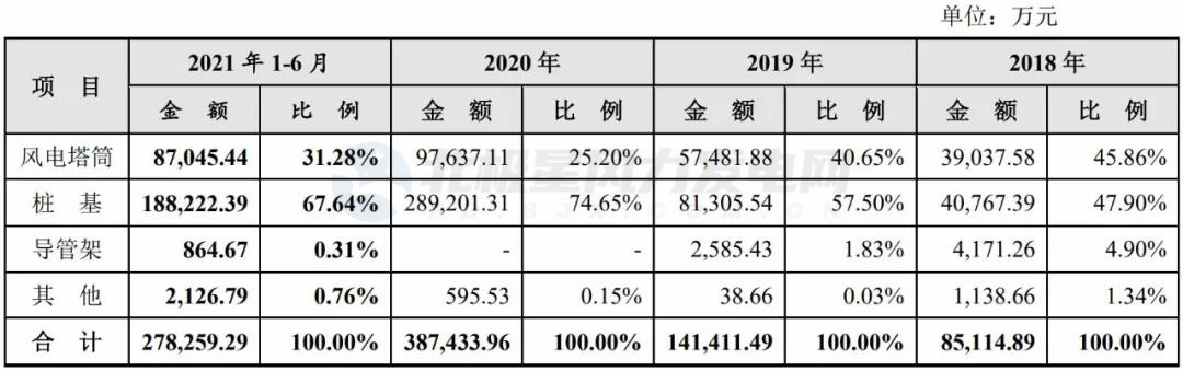 2021年半年报显示,海力风电的主营业务为桩基、海上风电塔筒、其他业务、其他、陆上风电塔筒,占营收比例分别为:66.39%、30.06%、1.85%、0.75%、0.64%。报告期内,主要产品的销售收入及占比情况如下: