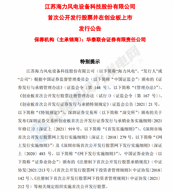 11月11日,江苏海力风电设备科技股份有限公司(以下简称“海力风电”)发布首次公开发行股票并在创业板上市发行公告,本次公开发行股票数量约为5435万股,发行价格为60.66元/股;2021年11月15日进行网上、网下申购。申购简称为海力风电,申购代码为301155。