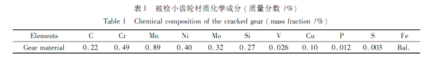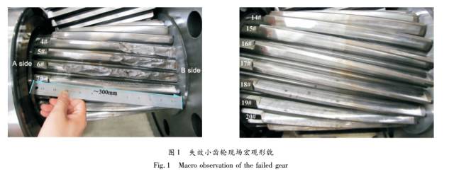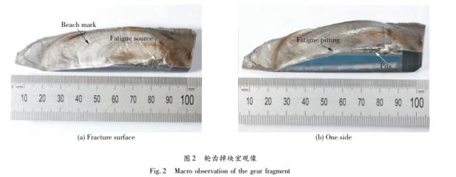 失效齿轮的宏观形貌采用高级数码相机记录。同时,断口形貌还采用了超景深体视显微镜进行观察和记录局部微观特征采用FEIQuanta。600扫描电镜进行表征金相组织表征采用O-LYMPUSGX71金相显微镜,在轮齿上垂直于齿面切割金相样品,观察截面金相组织首先将样品在400#~2000#砂纸上依次打磨,并用金刚石抛光膏抛光后,采用无水乙醇清洗后冷风吹干。采用4%(质量分数)硝酸酒精溶液腐蚀金相组织金相观察结束后,采用热镶制作样品进行硬化层显微硬度梯度测试,采用的仪器是AH43全自动显微硬度仪齿轮表面粗糙度采用A-StepIQ表面轮廓仪进行分析。失效小齿轮现场宏观像如图1所示:从图1a中可以看到,一些轮齿损伤严重,轮齿折断。