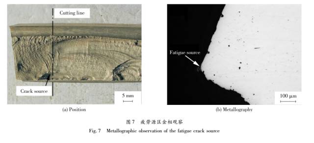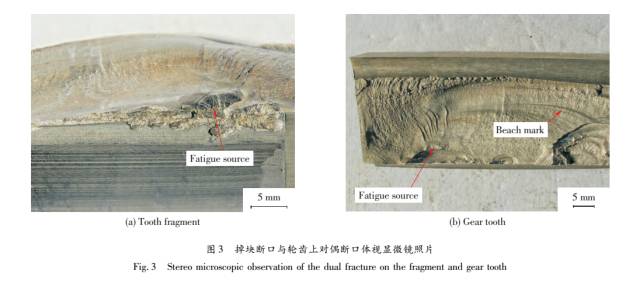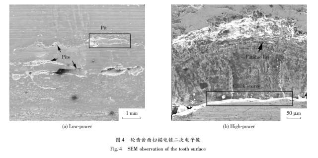 根据断口微观观察结果,疲劳裂纹并未直接在齿面萌生,而是萌生于剥落坑的底部。这说明齿面上先产生了剥落坑,剥落坑的产生导致齿面几何形状发生显著变化导致在剥落坑底部产生应力集中,在疲劳源区的并未发现夹杂等缺陷,这说明应力集中是疲劳裂纹萌生的主要原因同时也说明剥落坑在时间序列上早于疲劳裂纹萌生。