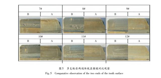 从宏观上看,失效的轮齿端部有明显的压痕,在压痕处已经发生了明显的塑性变形。图5为部分编号轮齿所示AB两端端部的体视显微镜图像,可见,轮齿端部有明显的压痕,在压痕处,齿面上发生接触疲劳,产生了麻点区。通过多支轮齿的对比观察发现,轮齿B端压痕较A端显著,说明在工况条件下B端承受的载荷高于A端,所以B端塑性变形更严重。同时因接触疲劳产生的麻点,B端麻点区面积明显较A端大,A端麻点区破坏较轻,几乎看不到显著塑性变形。