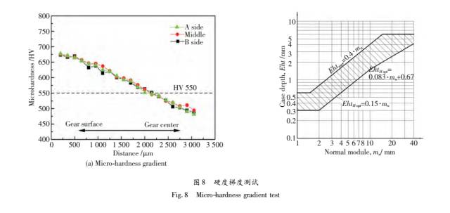 根据金相组织分析结果,齿轮表面采用了渗碳淬火,有硬化层,因而采用全自动显微硬度仪对齿面节圆附近A端中间和B端分别进行硬度梯度测试,测试结果未发现差异(图8a)。根据ISO2639和ISO6336标准中关于渗碳层深度的定义和要求:渗碳层深度是以表面到显微硬度HV550处的距离,根据测试结果,对失效齿轮渗碳层深度进行分析和计算,渗碳层深度约为2.0mm,参考图8b中ISO6336关于硬化层深度的数值要求,这一数值落在硬度的最优值区间中,满足标准要求。