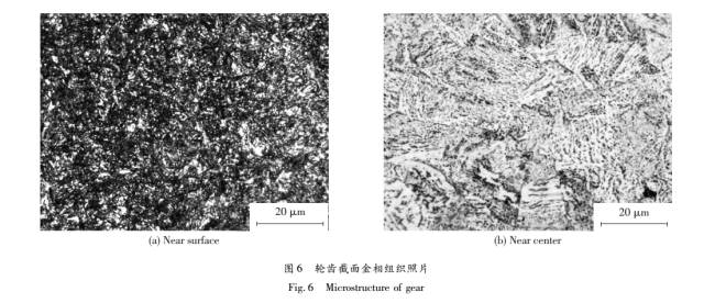 齿轮硬度测试分为两部分:齿面硬度和心部硬度。风电齿轮箱中速轴小齿轮对齿面的硬度要求是洛氏硬度HRC58~62,齿面硬度略低于标准要求。风电齿轮箱中速轴小齿轮对心部的硬度要求是HRC33~45,心部硬度测试结果为洛氏硬度均值HRC为35,基本满足要求。