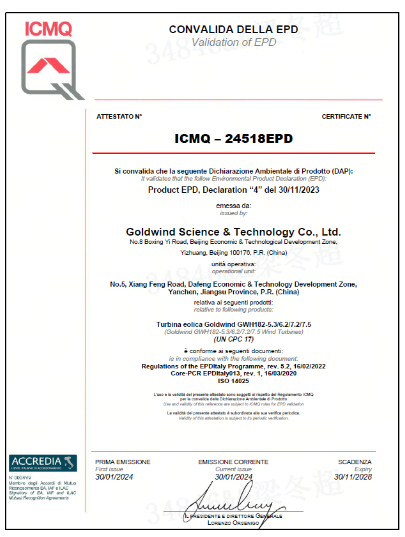 近日,中电协副会长单位金风科技GWH182系列,5.3MW、6.2MW、7.2MW、7.5MW四个型号的风电机组获得由ICMQ(意大利质量标志研究所)颁发的EPD Italy体系下的环境产品声明(Environmental Product Declaration,EPD)认证证书。