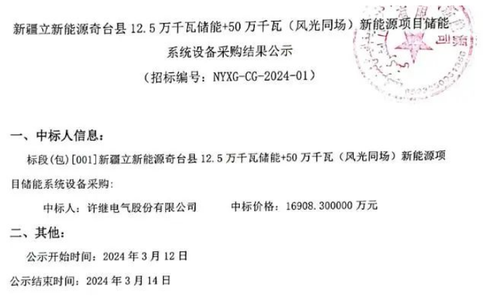 3月12日,新疆立新能源奇台县12.5万千瓦储能+50万千瓦(风光同场)新能源项目储能系统设备采购结果公示发布,中电协会员单位许继电气股份有限公司以16908.3万元中标该项目,折合单价0.564元/Wh。