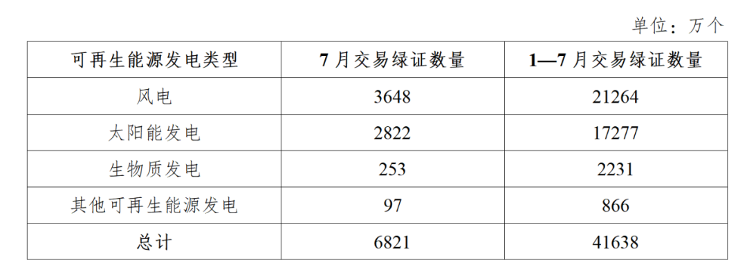 2025年7月,全国交易绿证6821万个,其中绿色电力交易绿证3472万个。2025年1-7月,全国交易绿证4.16亿个,其中绿色电力交易绿证1.41亿个。